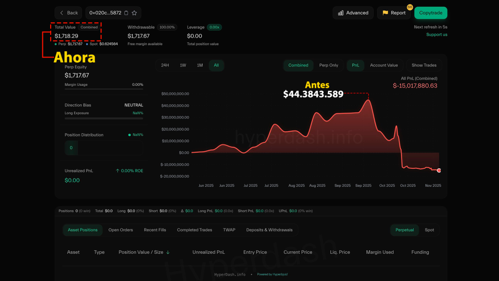 Según datos, el mercado sufrió una de sus peores jornadas del trimestre con liquidaciones superiores a $1.380 millones en posiciones largas durante un solo día. El operador 0xc2a3, conocido por haber mantenido una tasa de aciertos del 100 %, vio cómo su balance pasó de +$33 millones a –$26 millones, lo que refleja una pérdida acumulada de $44.67 millones.