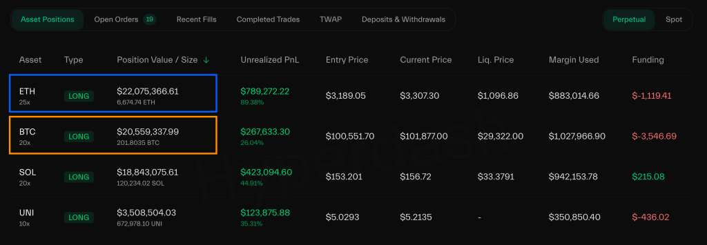 En contraposición al sentimiento de capitulación, varias ballenas han cambiado de dirección. El operador identificado como 0x9263, con una tasa de éxito del 73,7 %, cerró 20 operaciones rentables desde octubre por $23.7 millones y ahora abrió largos en BTC, ETH, SOL y UNI. Según datos de HyperDash, estas posiciones presentan ganancias no realizadas de $1.6 millones, lo que indica confianza en una recuperación de corto a mediano plazo.