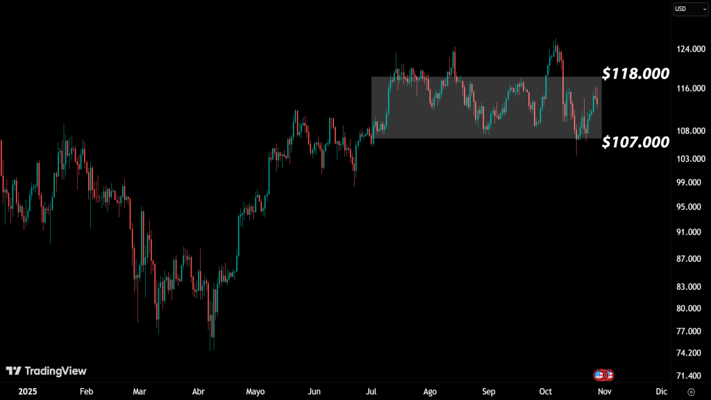 - Nivel de precios y soportes: Según reportes, Bitcoin ha consolidado por debajo de su máximo histórico reciente (~US $ 112.000) y ha mantenido niveles de soporte clave sin ceder, lo que refuerza la idea de demanda persistente.
