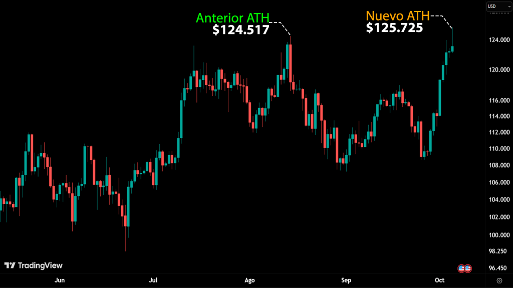 - Nuevo máximo histórico: Bitcoin alcanzó los USD $125.725 durante la madrugada del 5 de octubre de 2025.