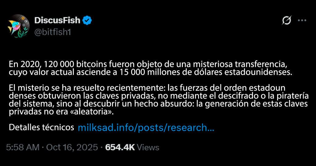 En términos prácticos, el software que Lubian empleó para generar las claves no produjo números verdaderamente aleatorios, lo que permitió —potencialmente incluso a fuerzas del orden— calcular las claves privadas y acceder a los fondos.