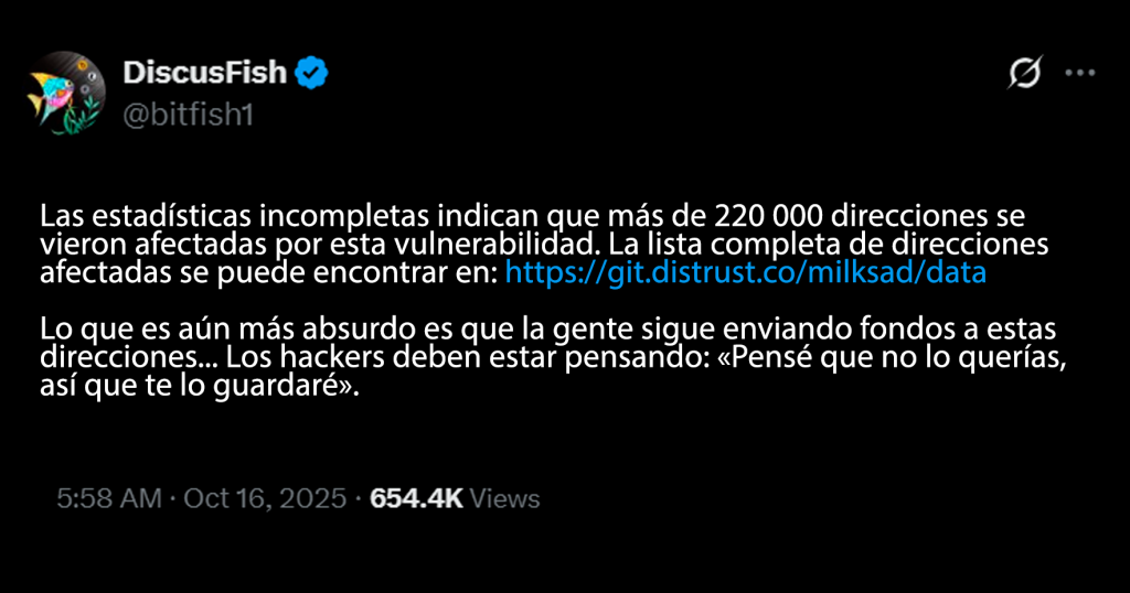 Esta falla está relacionada con la vulnerabilidad documentada como CVE-2023-39910, conocida como “Milk Sad”, una debilidad descubierta en la herramienta Libbitcoin Explorer (bx).