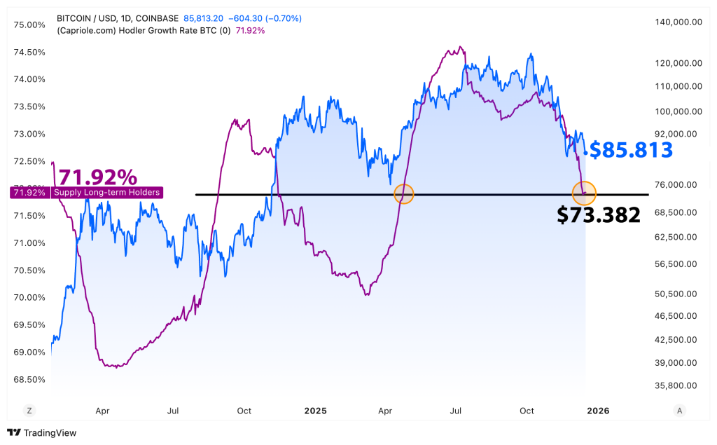 - El suministro de Bitcoin en manos de tenedores a largo plazo cayó a 71,9%, el nivel más bajo en ocho meses, coincidiendo con un debilitamiento técnico del precio.