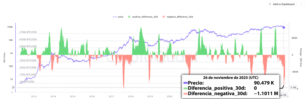Los datos de variación del suministro de LTH muestran que, en un período móvil de 30 días, el mercado absorbió una salida neta de hasta 1,1 millones de BTC a finales de noviembre, la segunda mayor caída histórica registrada para este grupo. Incluso tras moderarse, el retroceso reciente sigue siendo significativo: 761.000 BTC menos en solo un mes.