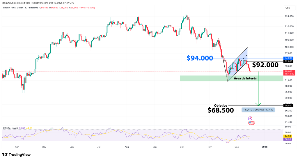 - $68.500, objetivo técnico del patrón bajista, alineado con la media móvil de 200 semanas.