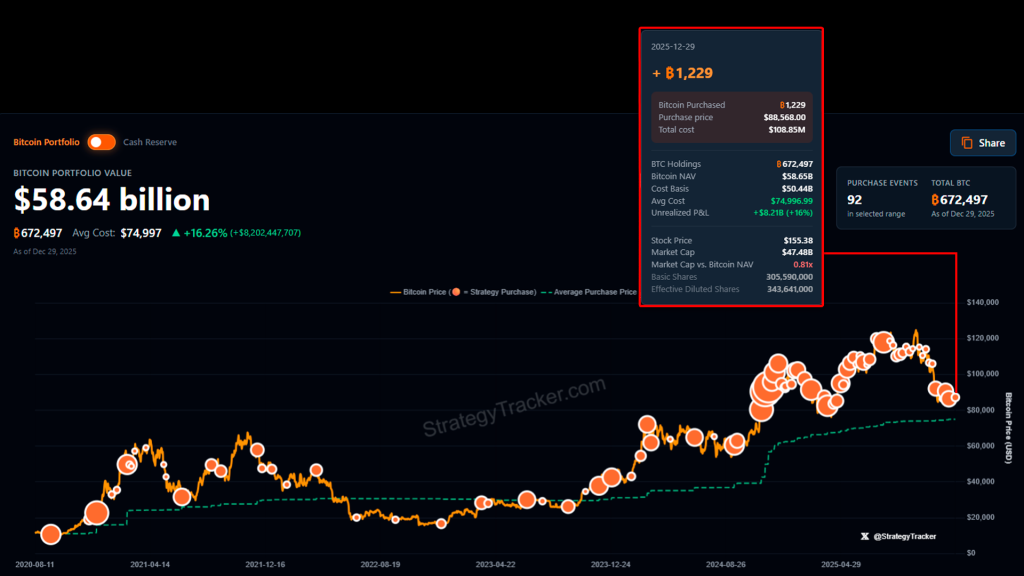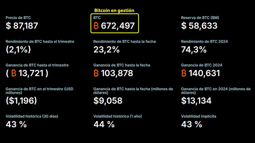Con esta operación, Strategy acumula 672.497 BTC, adquiridos por un total aproximado de 50.440 millones de dólares. A precios de mercado cercanos a 87.300 dólares por bitcoin, esas tenencias se valoran en torno a 58.700 millones de dólares, lo que representa una ganancia no realizada superior a 8.000 millones de dólares.