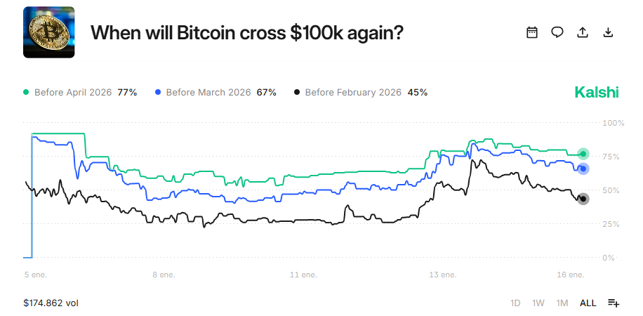 En mercados de predicción como Polymarket y Kalshi las apuestas muestran un escenario dividido. Por ejemplo, el mercado en Kalshi que especula si bitcoin tocará los $100.000 antes del 1 de febrero, cotiza en torno a los 45 centavos, lo que se traduce en una probabilidad del 49%.