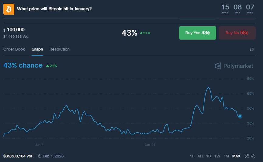 En Polymarket la tendencia de cautela es similar, con un 43% de probabilidades actualmente de que BTC alcance los $100.000 en la apuesta «¿Qué precio alcanzará Bitcoin en enero?», con un volumen de más de $35 millones. Al igual que en Kalshi, días atrás la confianza del mercado en la ruptura de la marca superaba el 72%.