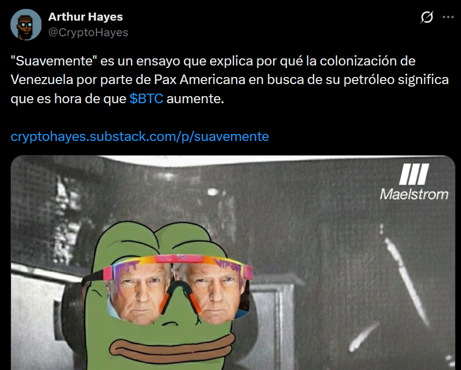 $200.000 por Bitcoin es el nivel que vuelve a circular en el mercado tras la más reciente tesis de Arthur Hayes, cofundador de BitMEX y actual CIO de Maelstrom. El detonante, según su análisis, no es un halving, ni un ETF, ni una innovación técnica en la red, sino un evento geopolítico de alto impacto: la captura de Nicolás Maduro en el marco de una ofensiva liderada por la administración de Donald Trump.