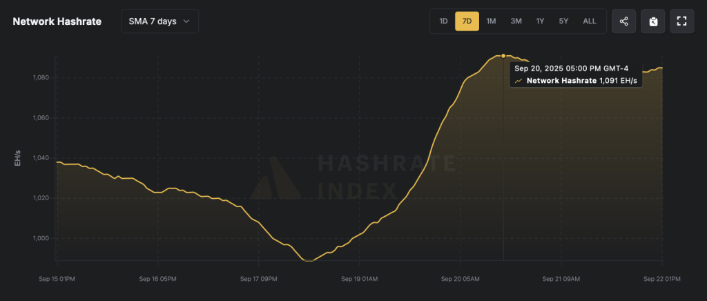 1.091 zettahash por segundo. Ese fue el hito alcanzado el 20 de septiembre de 2025, cuando la red Bitcoin registró su mayor potencia de cómputo en la historia. Apenas dos días después, la cifra se mantenía estable en 1.082,29 EH/s, evidenciando la fortaleza del ecosistema minero. Este récord se produce en un entorno adverso, marcado por una caída del 12,41% en el “precio de hash”, que pasó de 57,12 $ a 50,03 $ por petahash en solo un mes.