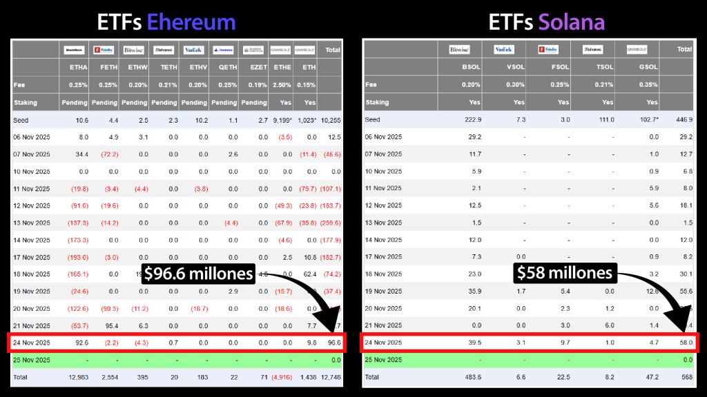 Los ETF de Ethereum y Solana recibieron entradas por $97 millones y $58 millones, respectivamente. El caso de SOL destaca: ha logrado 20 días consecutivos de entradas desde su lanzamiento, impulsado por una rotación selectiva del capital institucional.