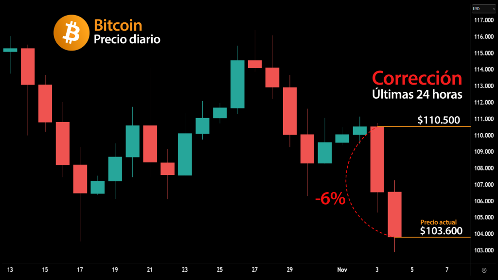 El Bitcoin pasó de cerca de $110.500 a un mínimo intradía de $103.600, registrando una caída cercana al 6% en 24 horas. Esta ruptura puede haber activado cascadas de liquidación automáticas al desplomarse el mercado de derivados.