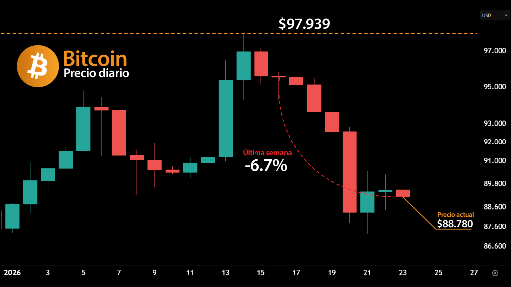En paralelo, el desempeño reciente del precio refuerza esa cautela. Bitcoin cayó 6,7% en la última semana y se mantiene alrededor de los $89.000, con un retroceso cercano al 1% en las últimas 24 horas. La incapacidad de sostener los rebotes ha debilitado la narrativa de fortaleza inmediata que dominaba a mediados de enero. Esto contrasta con lo que ocurría apenas semanas atrás. El 15 de enero, Bitcoin alcanzó los $97.000, y en ese momento los usuarios del mercado de predicciones asignaban una probabilidad del 87% a un movimiento hacia los $100.000. El cambio no ha sido gradual, sino abrupto, y coincide con un entorno macro que ha vuelto a introducir volatilidad exógena.