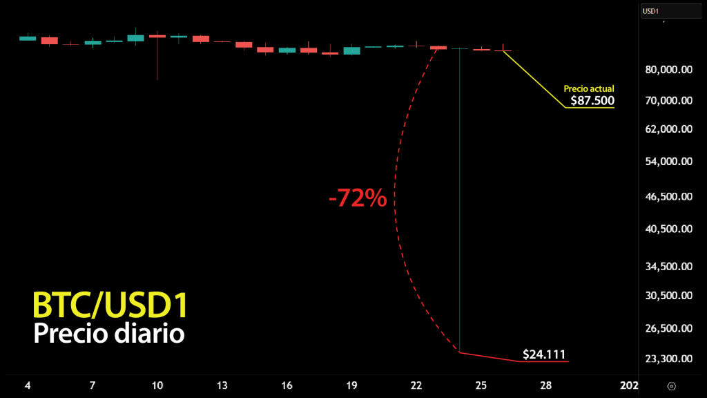 La imagen de Bitcoin desplomándose hasta los $24.111 puede resultar alarmante a primera vista. Sin embargo, el movimiento no ocurrió en el mercado principal ni reflejó un colapso real del activo. El episodio se concentró exclusivamente en el par BTC/USD1 de Binance y duró apenas unos segundos antes de que el precio regresara a niveles cercanos a los $87.000. Aun así, el evento deja una lección relevante para los operadores: la liquidez importa, y mucho.