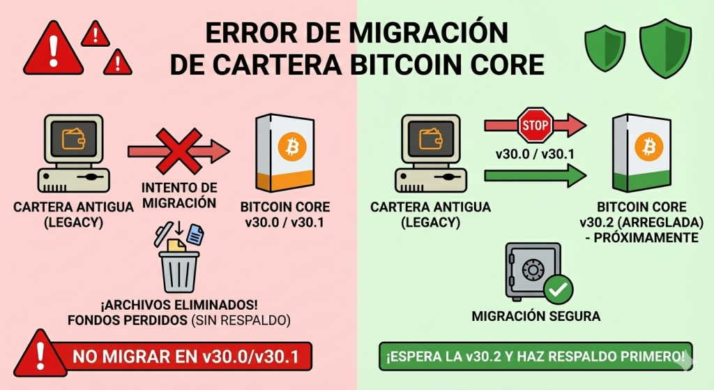 - Ante el riesgo de pérdida total de fondos por la destrucción de claves privadas, Bitcoin Core instó a los usuarios a no actualizar ni migrar billeteras antiguas hasta el lanzamiento de la versión 30.2