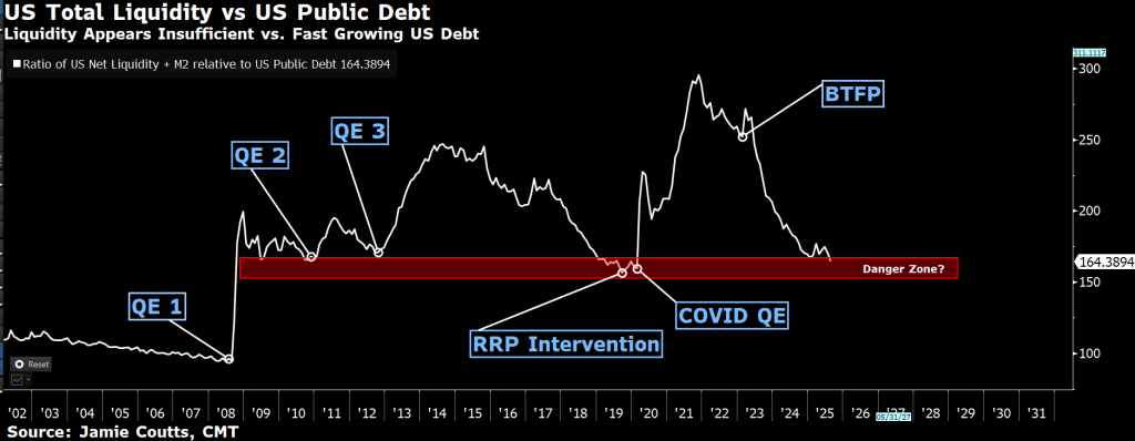 Jamie Coutts, estratega de Realvision, agrega un matiz clave: la deuda está creciendo más rápido que la liquidez. Cuando el ratio liquidez/deuda es bajo, los activos de riesgo se tornan vulnerables. En EE. UU., la situación ya apunta a tensiones de financiación que podrían amplificarse en el corto plazo.