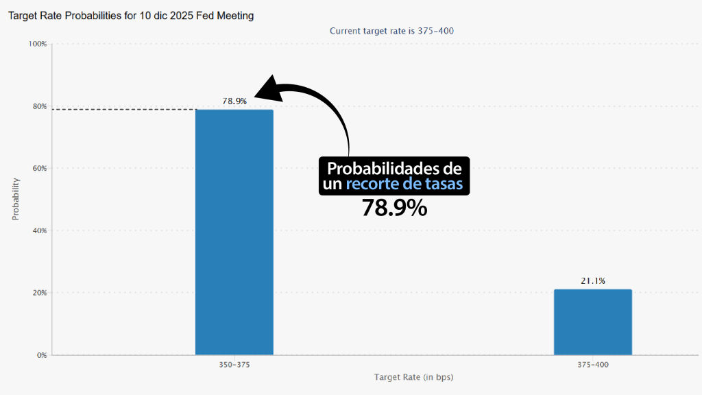 Gran parte de la volatilidad reciente a los cambios abruptos en las expectativas del mercado sobre la política monetaria. Los traders pasaron de asignar un 90% de probabilidad a un recorte en diciembre, a reducirla al 30%, para luego elevarla nuevamente por encima del 70%.