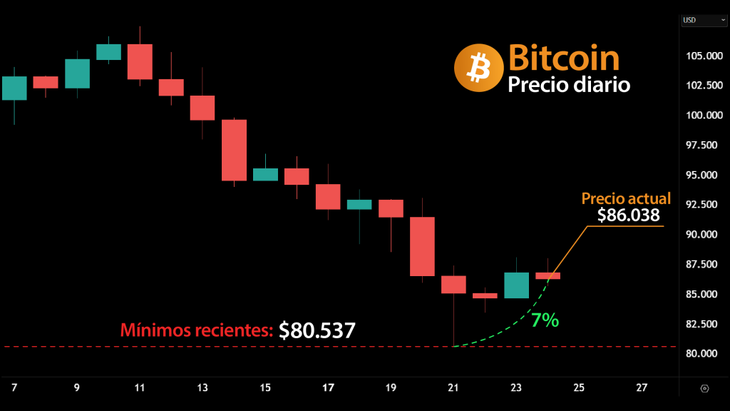 La política monetaria regresa al centro del debate La tendencia bajista iniciada en octubre llevó a Bitcoin a tocar los $80.537 el 21 de noviembre, su nivel más bajo desde abril. Desde entonces, el precio ha logrado una recuperación moderada, situándose alrededor de $86.000, un avance cercano al 1% en las últimas 24 horas.
