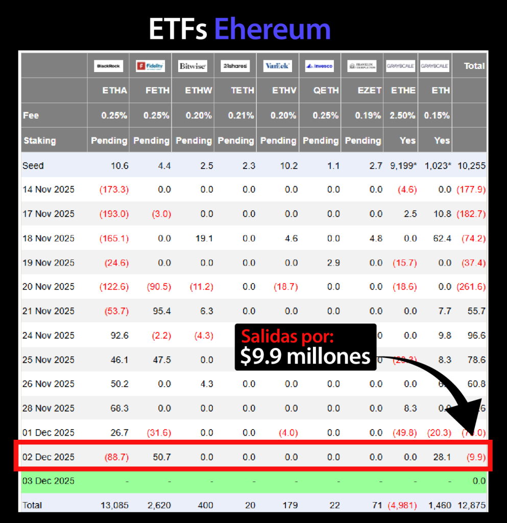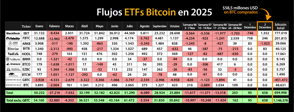 Por su parte, los ETF al contado en EE. UU. registraron $58,5 millones de dólares en entradas netas el 2 de diciembre, encadenando cinco días consecutivos de flujos positivos. Los productos ligados a Solana acumularon $45,8 millones, mientras que los ETF de Ethereum mostraron salidas por $9,9 millones.