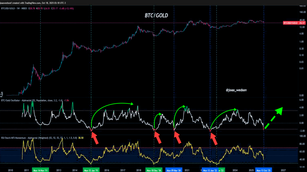 Además, destaca la relación BTC/Oro como indicador adelantado: históricamente, el oro se anticipa entre 60 y 90 días antes de que Bitcoin rompa al alza. Esa métrica, sostiene, ya habría tocado fondo.