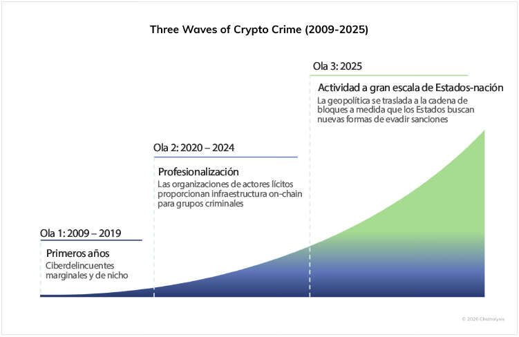 De ciberdelito marginal a infraestructura estatal Se describe 2025 como el inicio de una tercera fase en la evolución del crimen cripto. La primera, entre 2009 y 2019, estuvo dominada por ciberdelincuentes de nicho. La segunda, entre 2020 y 2024, marcó la profesionalización del delito, con organizaciones que ofrecían servicios especializados de fraude, hackeo y lavado. La tercera fase es cualitativamente distinta: Estados soberanos y actores alineados con ellos comenzaron a utilizar estas mismas cadenas de suministro ilícitas para evadir sanciones financieras y sostener operaciones geopolíticas.