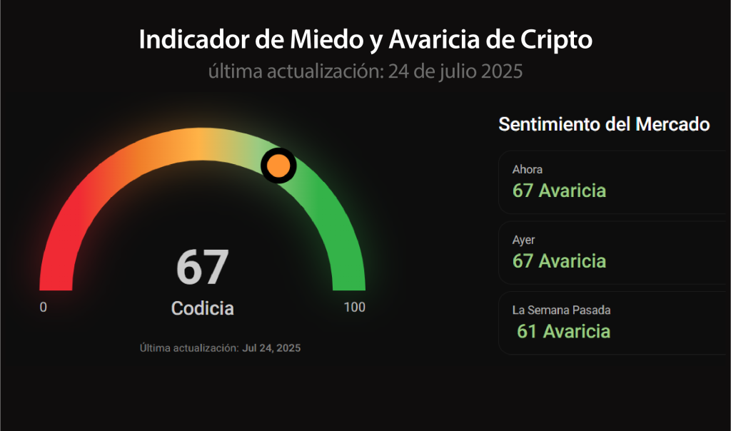El Índice de Miedo y Avaricia se mantiene en 67 (avaricia), reflejando un mercado que quizás había asumido demasiado riesgo antes de tiempo.