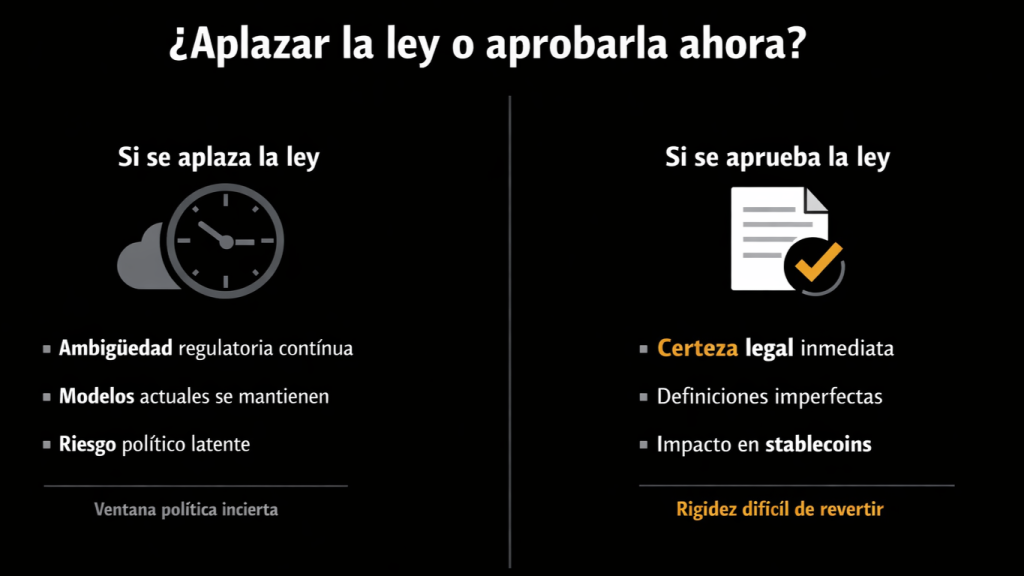 • ¿Es preferible certeza regulatoria inmediata o mantener la ambigüedad para proteger modelos de negocio clave como las stablecoins?
