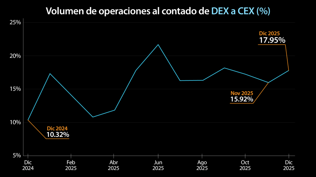 Los exchanges descentralizados no fueron inmunes a la desaceleración. En diciembre, el volumen total en DEX cayó a $245.000 millones, lo que supone una disminución del 20% frente a los $306.000 millones de noviembre y del 46% en comparación con los $451.200 millones de octubre. Lo más relevante no es solo la caída absoluta, sino la evolución relativa. La relación entre el volumen de DEX y CEX aumentó hasta el 17,95% en diciembre, frente al 15,92% de noviembre y apenas el 10,32% registrado en diciembre de 2024. En otras palabras, aunque se negoció menos en términos generales, una mayor proporción de esa actividad se desplazó hacia plataformas descentralizadas.
