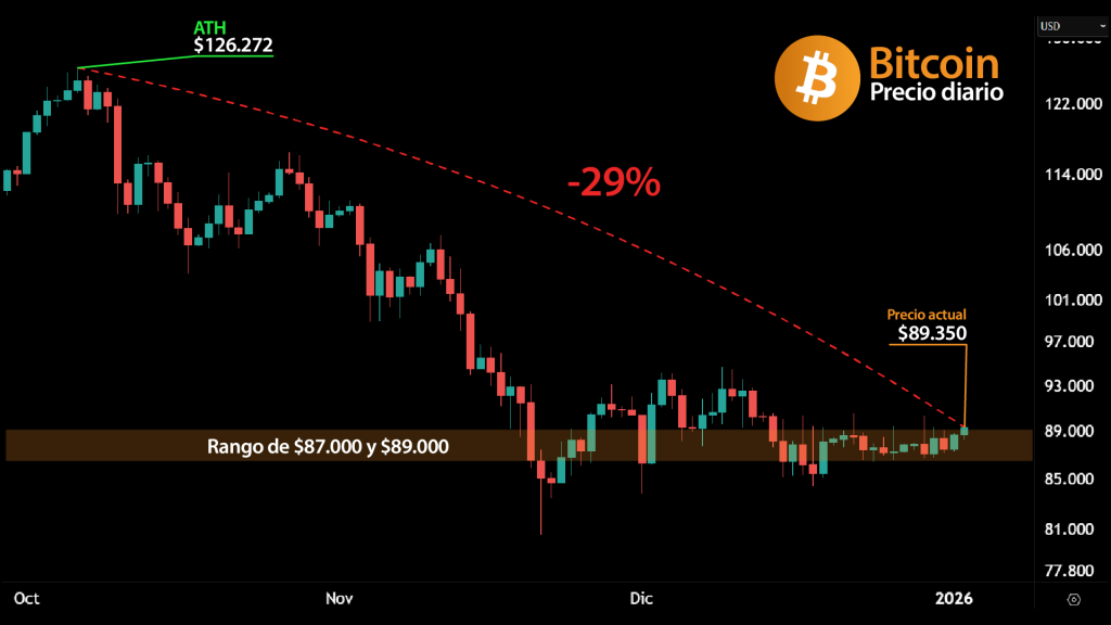 La caída del volumen coincidió con una corrección más amplia del mercado que se extendió hacia el inicio del nuevo año. Al momento de redactar este artículo, Bitcoin cotiza en torno a los $89.350, con un avance diario del 1,61%, pero todavía 29% por debajo de su máximo histórico alcanzado en octubre. El comportamiento del precio refleja un mercado en consolidación. Bitcoin se ha movido mayormente dentro del rango de $87.000–$89.000, con volatilidad moderada y un sesgo neutral a bajista en el corto plazo. Sin embargo, los datos sugieren que los tenedores a largo plazo continúan acumulando en las caídas, un patrón que históricamente ha acompañado fases de transición más que de capitulación.