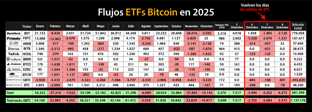 - Casi $1.000 millones salieron de los ETF spot en tres días, señal de cautela táctica.