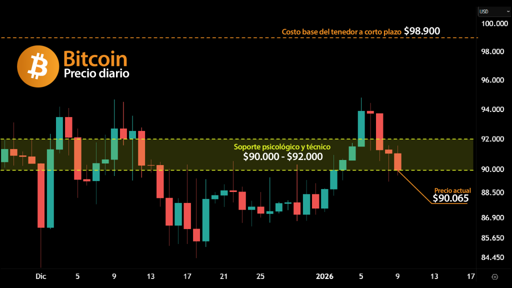 Niveles clave a vigilar Si Bitcoin logra estabilizarse y retomar intentos de avance, el costo base del tenedor a corto plazo en $98.900 emerge como siguiente referencia técnica. Superarlo con volumen ayudaría a descomprimir oferta dentro del rango superior. Por abajo, la zona de $90.000–$92.000 actúa como soporte psicológico y técnico de corto plazo.
