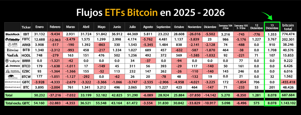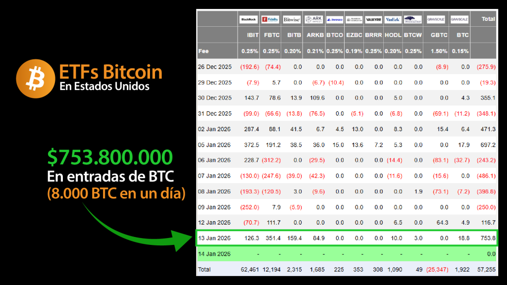 Tras varias semanas de cautela y reequilibrio de carteras a finales de año, los ETF de Bitcoin al contado en Estados Unidos volvieron a captar la atención del mercado. El martes, estos vehículos registraron entradas netas por $753,7 millones, el nivel diario más alto en tres meses, marcando un punto de inflexión relevante en el comportamiento del capital institucional.