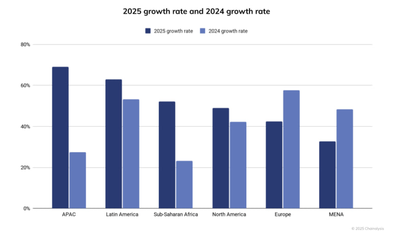 • La región de Asia-Pacífico (APAC) se consolida como el epicentro del crecimiento, mientras que Norteamérica experimenta un fuerte impulso gracias a los ETF de bitcoin y una mayor claridad regulatoria