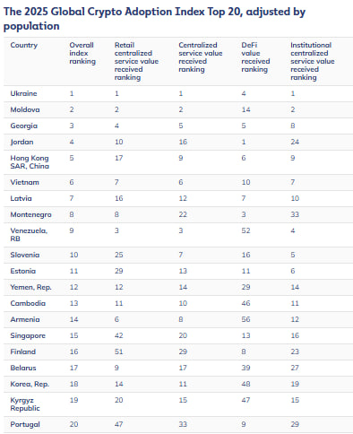 Bajo esta métrica, el panorama de adopción de criptomonedas cambia drásticamente, y es Europa del Este la región que domina de manera contundente. Ucrania ocupa el primer lugar, seguida de Moldavia y Georgia. También escalan a los primeros lugares países como Hong Kong, Letonia, Montenegro, Venezuela, Eslovenia, Estonia, Finlandia, entre otros.