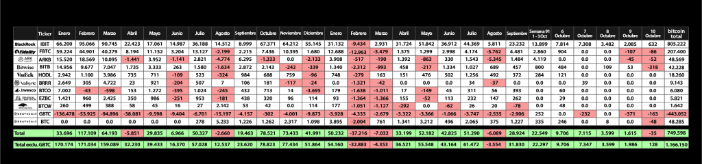 Durante las últimas semanas, los ETF de Bitcoin con sede en Estados Unidos han cosechado récords diarios superiores a $1.210 millones de dólares en entradas netas. Sin embargo, una mirada más fina revela que gran parte de esas entradas provienen del iShares Bitcoin Trust (IBIT) de BlackRock, que hasta la fecha no ha experimentado una salida mensual en octubre. De hecho, ha acumulado cerca de $4.210 millones de dólares en inversiones.