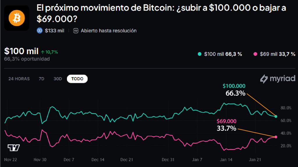 El deterioro del sentimiento también se refleja en los mercados de predicción. Las probabilidades de que Bitcoin alcance los $100.000 dólares cayeron un 21% durante la última semana. Actualmente, los usuarios asignan un 66% de probabilidades a un movimiento alcista hacia ese nivel, frente a escenarios más bajistas. En contraste, la probabilidad de que el próximo gran movimiento de Bitcoin sea hacia los $69.000 dólares aumentó desde el 14% el 17 de enero hasta niveles significativamente más altos. Este giro en las expectativas no implica necesariamente una predicción certera, pero sí ofrece una ventana clara al estado psicológico del mercado: el optimismo se ha enfriado de forma abrupta.