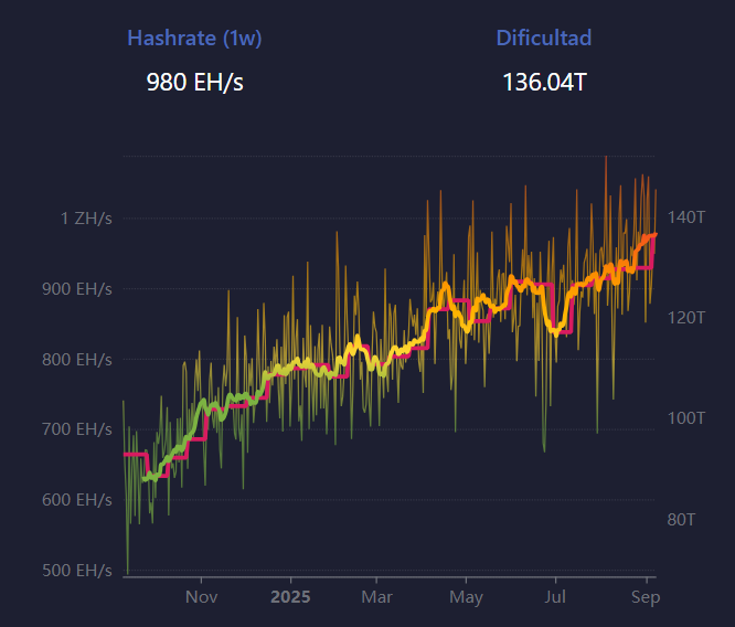 La escalada de la dificultad minera El último ajuste de la red, registrado en el bloque 913.248, elevó la dificultad en un 4 %, pasando de 129,6 a 136 billones. Se trata del quinto aumento consecutivo desde junio, lo que refleja la entrada de mayor potencia computacional al ecosistema.