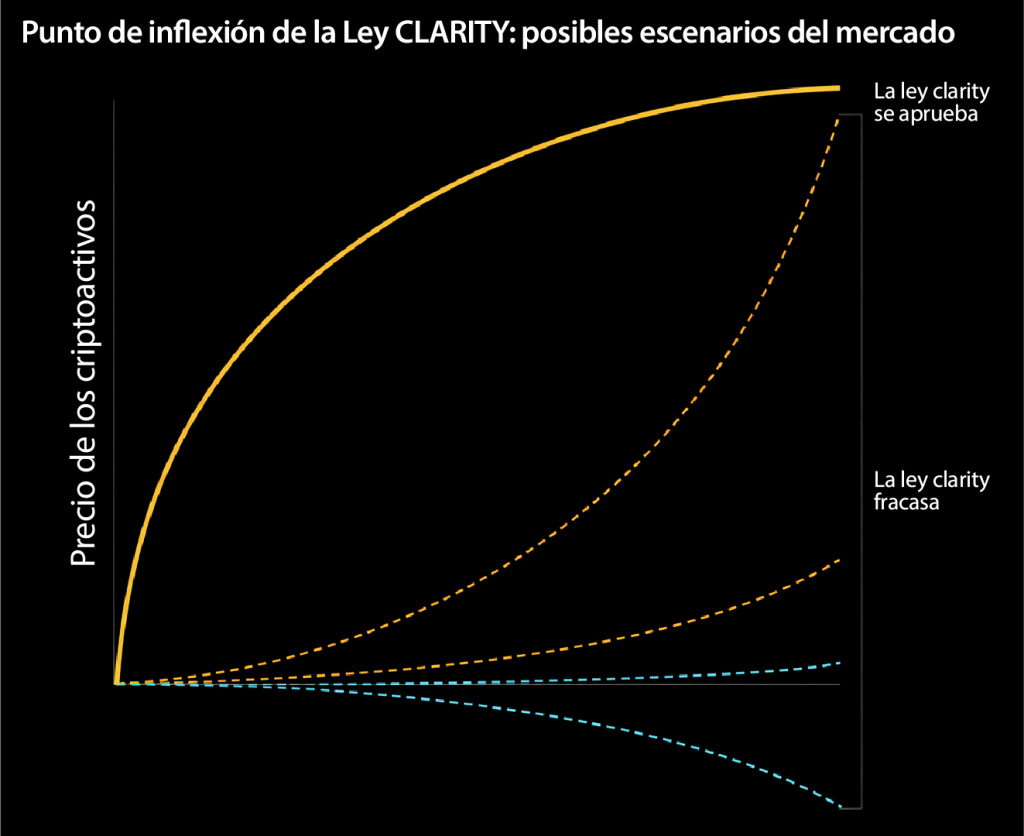 Desde el punto de vista del mercado, el desenlace de la Ley CLARITY marca dos trayectorias posibles. Una aprobación con términos aceptables para la industria podría desencadenar un repunte significativo, al despejar el camino para el crecimiento de las stablecoins y la tokenización financiera. En ese escenario, los precios responderían más a expectativas de expansión estructural.