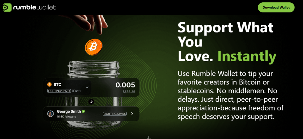 Rumble presenta wallet y habilita propinas en bitcoin y USDT para creadores