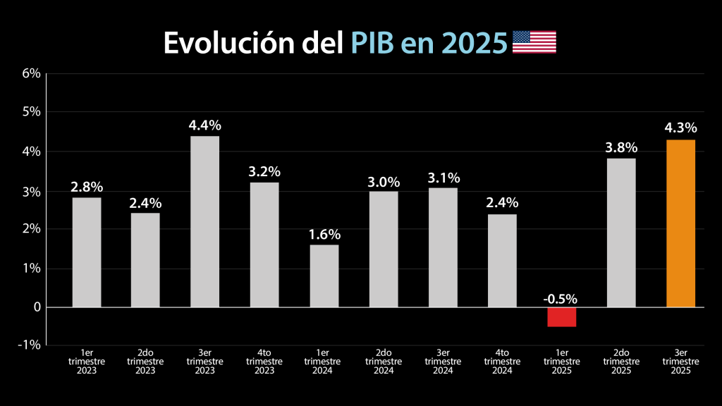 Mientras los ETF cripto enfrentaban salidas y los precios mostraban debilidad puntual, el mercado bursátil estadounidense ofrecía una imagen muy distinta. El S&P 500 subió 0,46 % el martes y cerró en un máximo histórico de 6.909,79 puntos. El Nasdaq Composite avanzó 0,57 %, y el Dow Jones Industrial Average sumó 0,16 %. Este rally estuvo respaldado por un dato macroeconómico relevante: el Departamento de Comercio informó que la economía de Estados Unidos creció a una tasa anualizada del 4,3 % en el tercer trimestre, superando el 3,8 % del trimestre anterior. Este crecimiento robusto refuerza la narrativa de una economía resiliente, aunque también introduce matices para los activos de riesgo, incluidos los criptoactivos, en un entorno donde las expectativas de política monetaria siguen ajustándose.