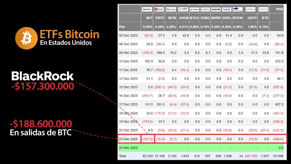 Los datos más recientes muestran que los ETF spot de bitcoin en Estados Unidos registraron salidas netas por $188,6 millones en la sesión del martes. Este movimiento marcó el cuarto día consecutivo de flujos negativos para estos productos, en un contexto de posicionamiento defensivo previo a las festividades navideñas. El fondo más afectado fue IBIT de BlackRock, que concentró $157,3 millones en salidas. A este comportamiento se sumaron FBTC de Fidelity, GBTC de Grayscale y BITB de Bitwise, todos con flujos negativos durante la jornada. En términos semanales, la presión se acentúa: los ETF spot de bitcoin acumularon $497,1 millones en salidas netas la semana pasada, revirtiendo las entradas por $286,6 millones registradas en la semana que finalizó el 12 de diciembre.