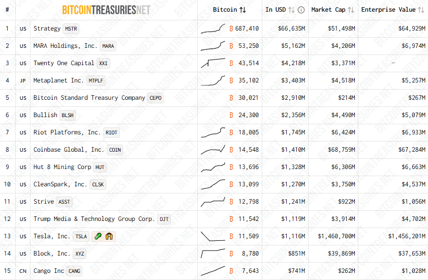 Top 15 de empresas con más BTC del mundo. Fuente: BitcoinTreasuries.net.