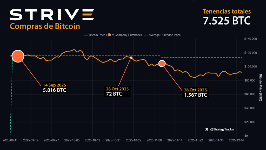 Strive anunció una oferta de mercado por $500 millones de dólares, destinada a financiar necesidades corporativas generales, entre ellas nuevas compras de Bitcoin. La firma podrá emitir Acciones Preferentes Perpetuas Serie A de Tasa Variable, lo que le otorga flexibilidad para acudir al mercado según lo ameriten las condiciones de liquidez. Este movimiento ocurre mientras sus reservas actuales muestran una pérdida significativa. De acuerdo con su propio rastreador corporativo, Strive acumuló 7.525 BTC, convirtiéndose en el 14.º mayor tenedor público de Bitcoin. Sus adquisiciones se concentran en tres momentos clave de 2025: