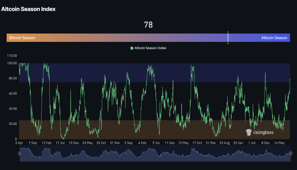 - El índice de temporada de altcoins alcanza 78, confirmando un cambio en el ciclo del mercado.