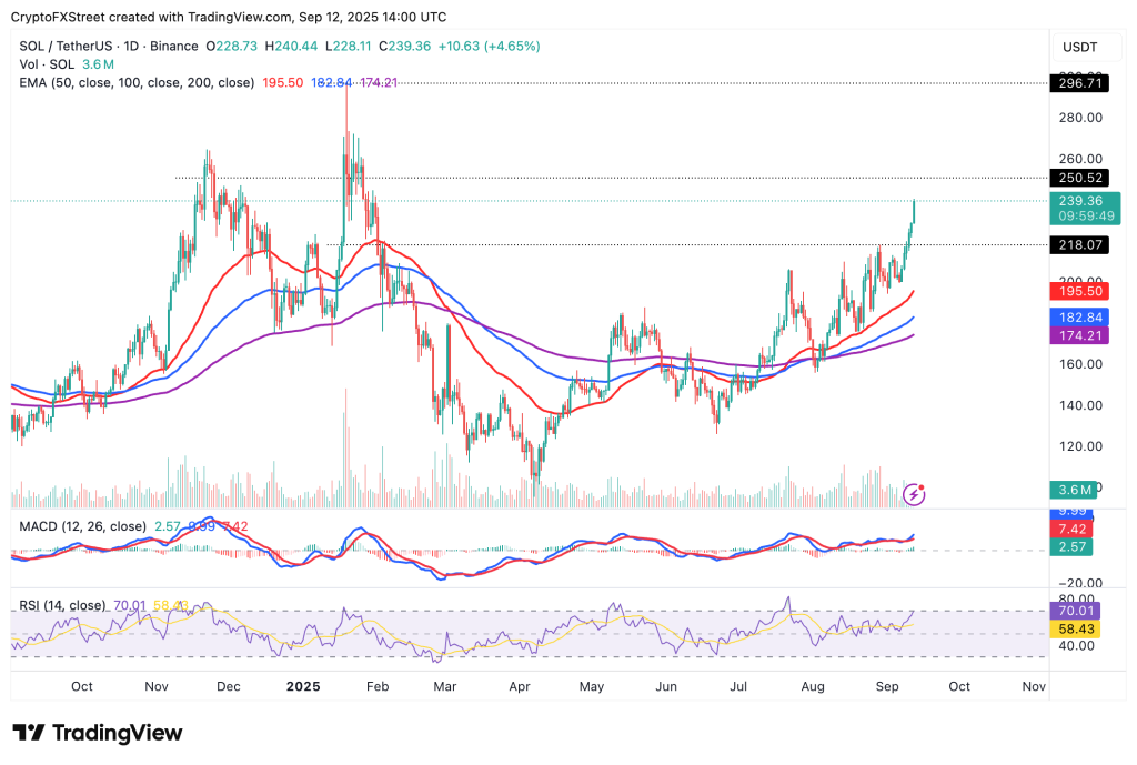 Solana se ha revalorizado 53% desde inicios de agosto, alcanzando los $239. Su estructura técnica presenta solidez: el precio se mantiene por encima de la EMA de 50 días en $195, la EMA de 100 días en $182 y se aproxima a la EMA de 200 días en $274.