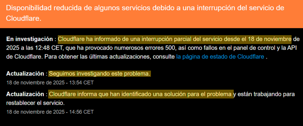 Cloudflare confirmó el incidente: “Estamos investigando un problema que afecta a varios clientes: errores 500 generalizados, así como fallos en el panel de control y la API”. El fallo se registró a las 11:48 UTC, un horario que coincide con actividad intensa de exchanges y plataformas globales.
