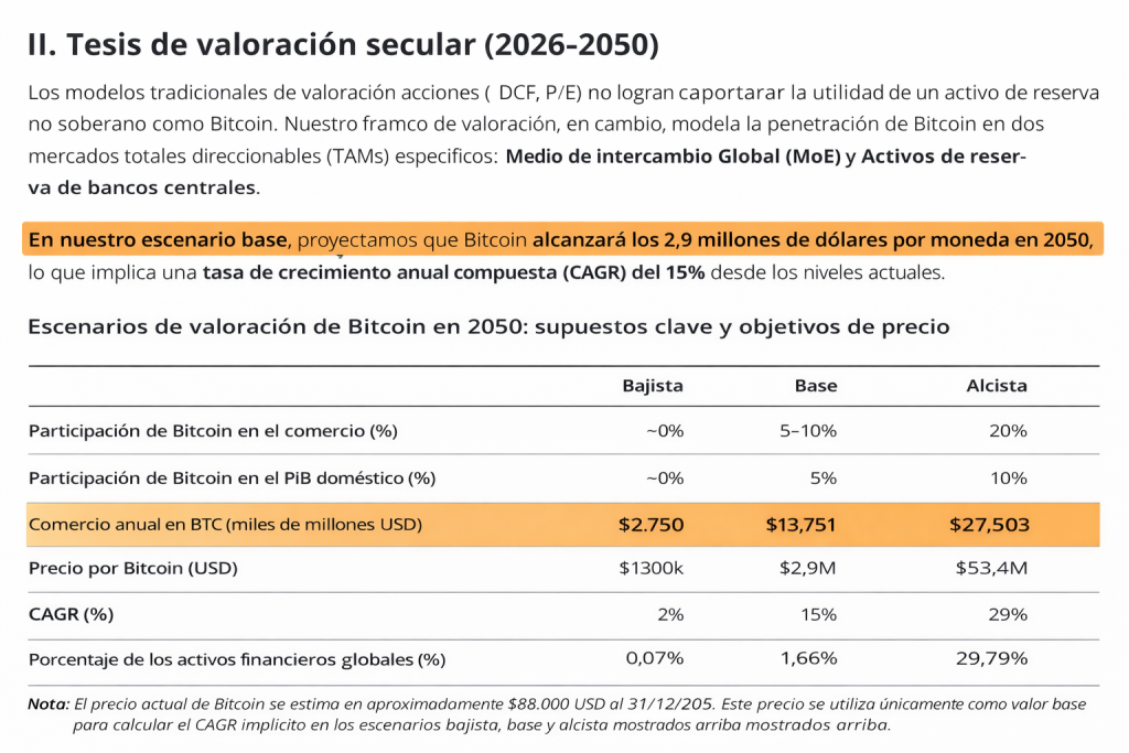 El modelo central de la firma plantea que Bitcoin podría alcanzar 2,9 millones de dólares por unidad en 2050, partiendo de supuestos conservadores dentro de un escenario base. La proyección se apoya en una tasa de crecimiento anual compuesta del 15 %, coherente con un activo que transita desde la periferia financiera hacia una función monetaria más clara.